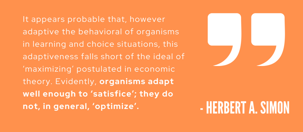 Instead, we settle for satisficing: a combination of ‘satisfy’ + ‘suffice’. We make decisions that meet our basic criteria for success but are probably not ideal.