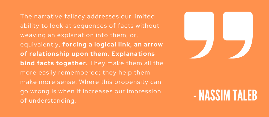 People like to think in terms of stories. So when we see a series of events or details, we connect them into a cause-and-effect narrative.