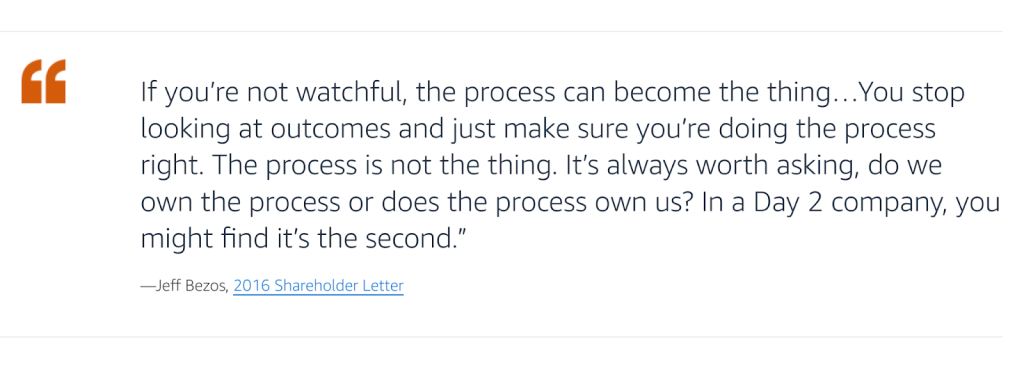 For Bezos, Day 1 Thinking is a startup mentality. It means rejecting stagnancy and embracing change.